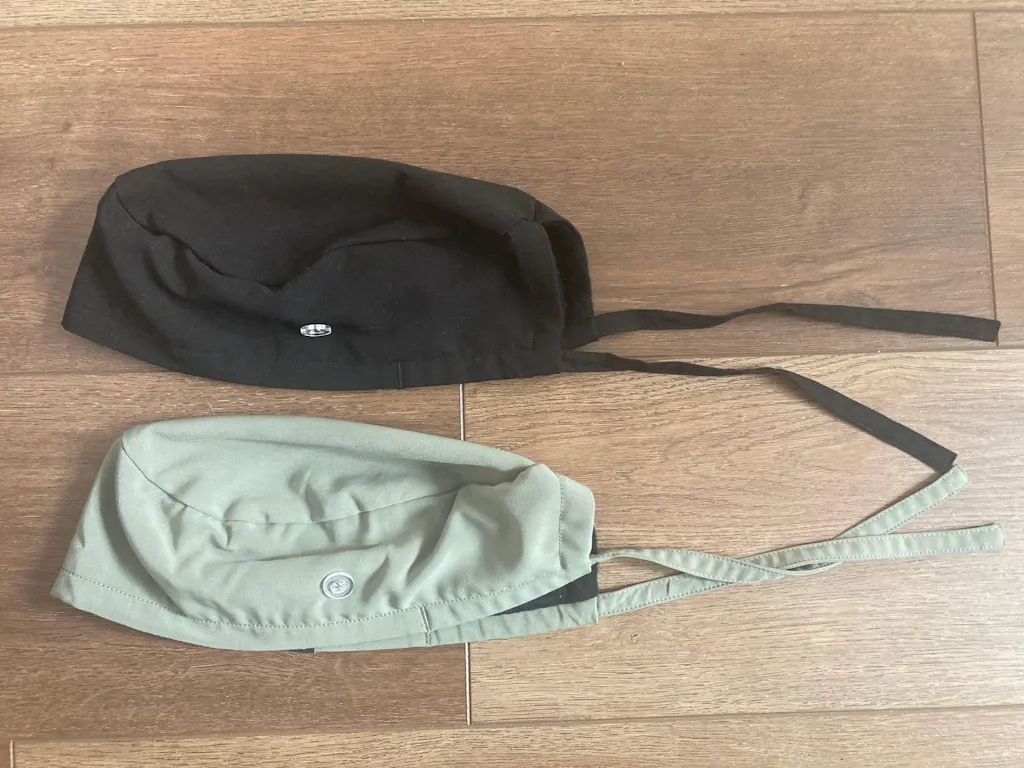 I the black scrub cap is very comfortable, nice material, and has buttons on the side for looping a mask. I love that it’s lined on the inside with a soft, absorbent (sweatband-like material). It fits well and looks very professional.